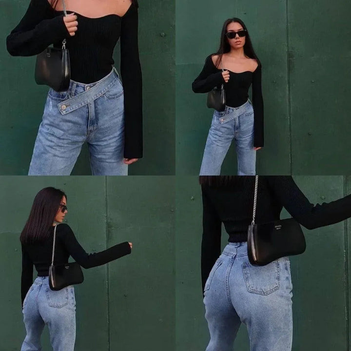Asimetrik kemerli, yüksek bel, dar paça jean.