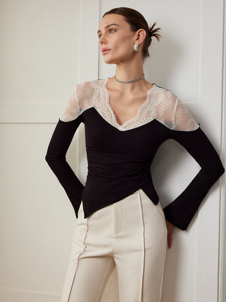 Zarif Dantel Panelli Şık Asimetrik Dar Bluz
