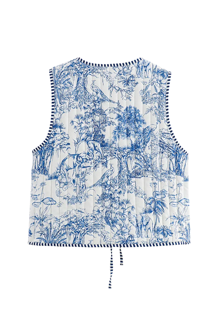 Vintage esintiler taşıyan bu desenli yelek, mavi-beyaz pastoral motifleri ve iç kısmındaki çizgili astarıyla çift yönlü bir şıklık sunuyor. Bağlamalı ön detayı sayesinde hem rahat hem feminen bir hava katar. Jean, basic bluz ya da elbiselerle kombinlenerek modern ve özgün bir stil yaratır.