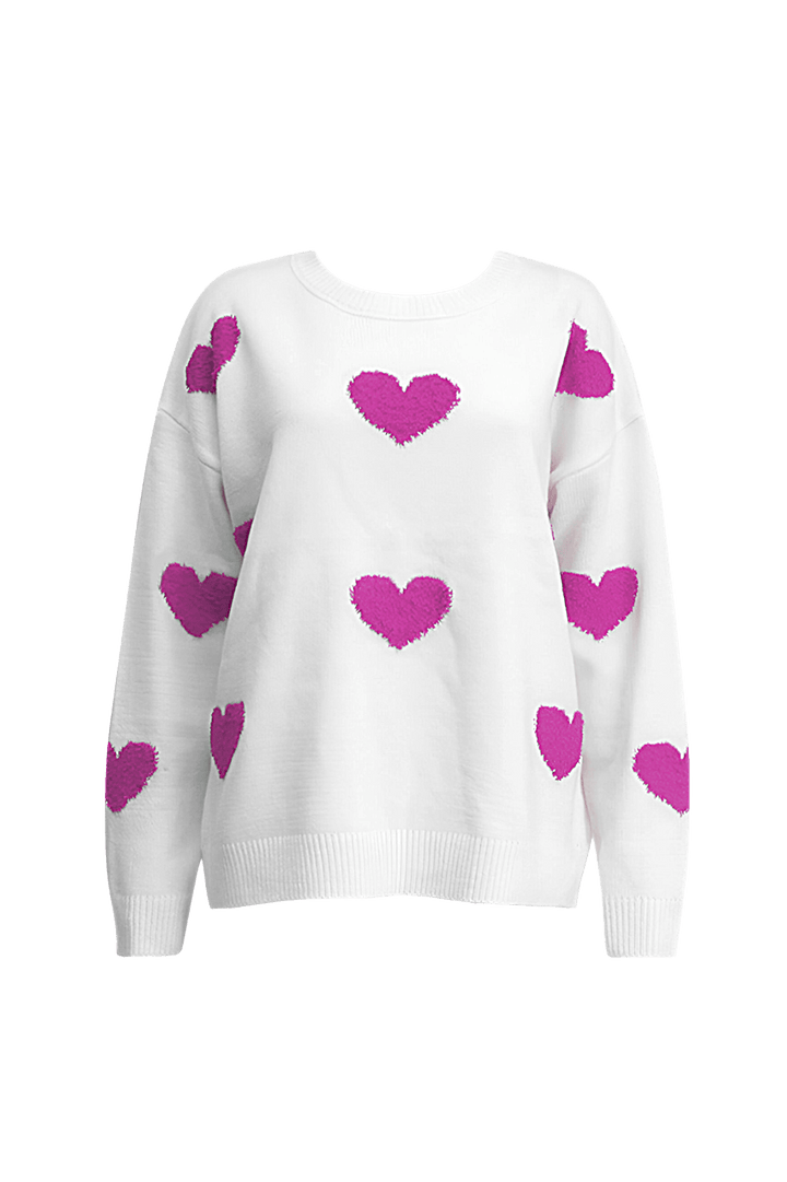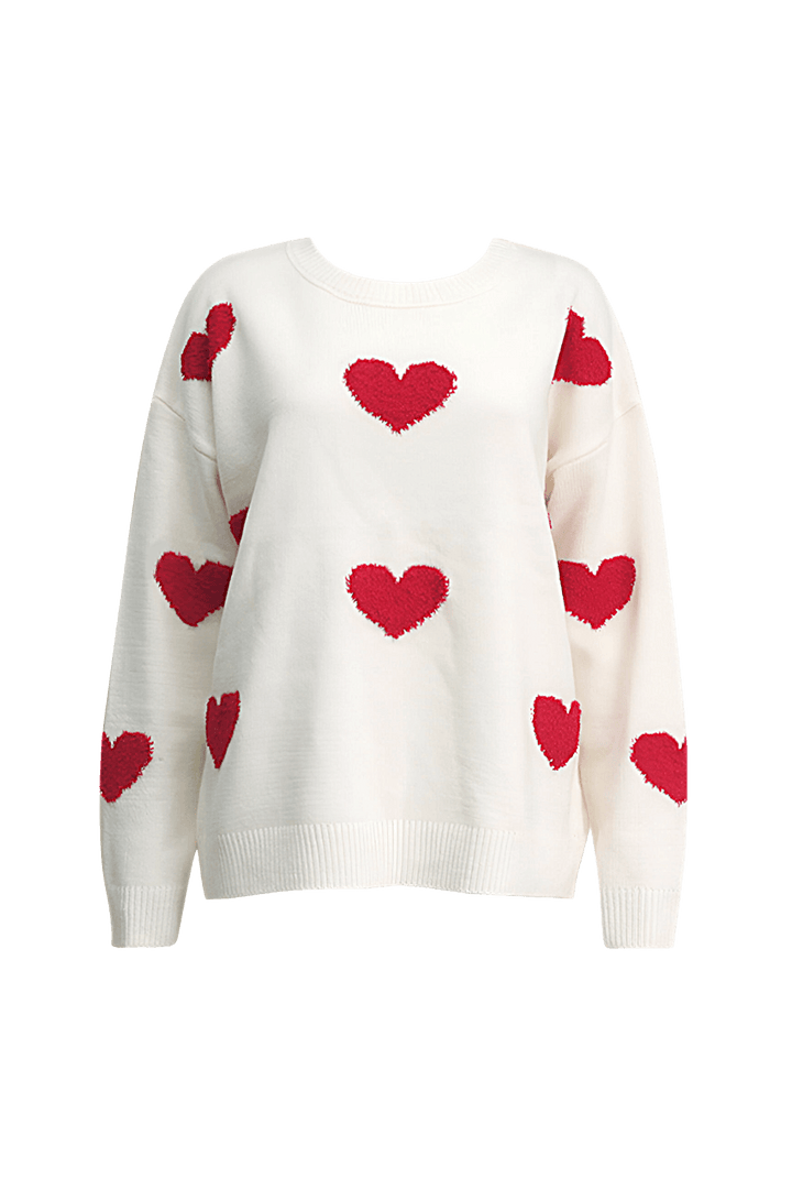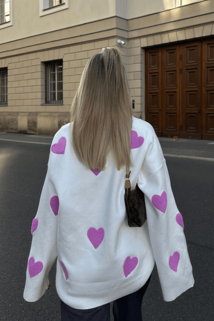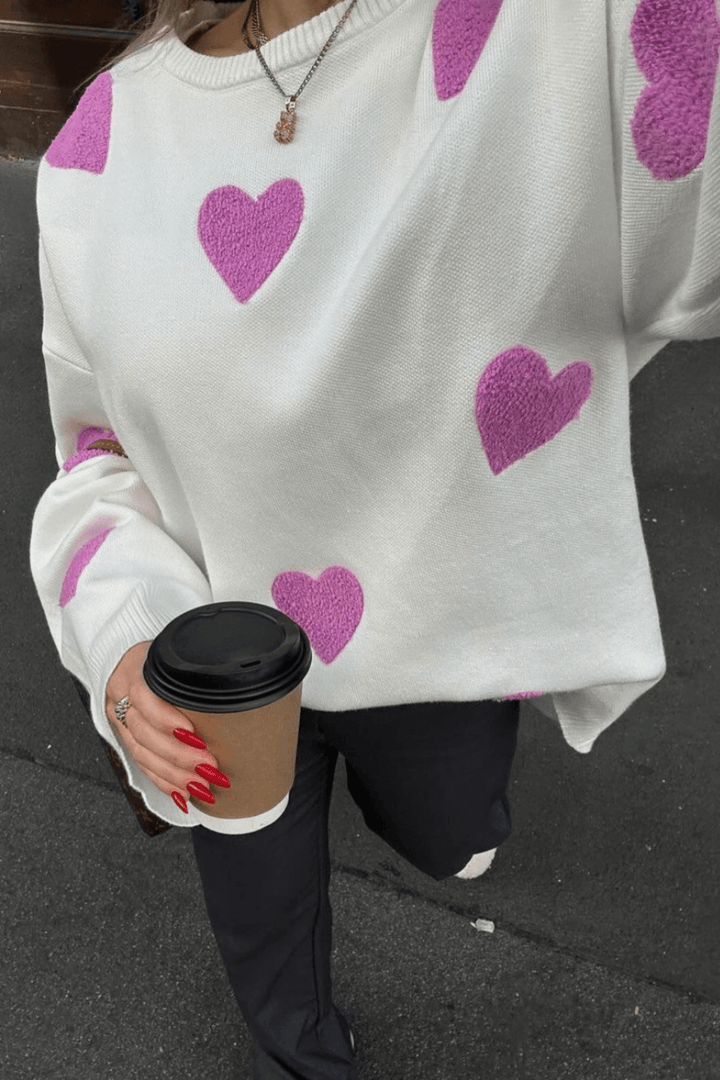 Kalp işlemeli ve klasik yuvarlak yakalı kazak kazaklarımızla zahmetsiz çekiciliği keşfedin. Bu örgü kazak bol ve rahat bir kesim için tasarlanmış olup hem konfor hem de stil sunar.