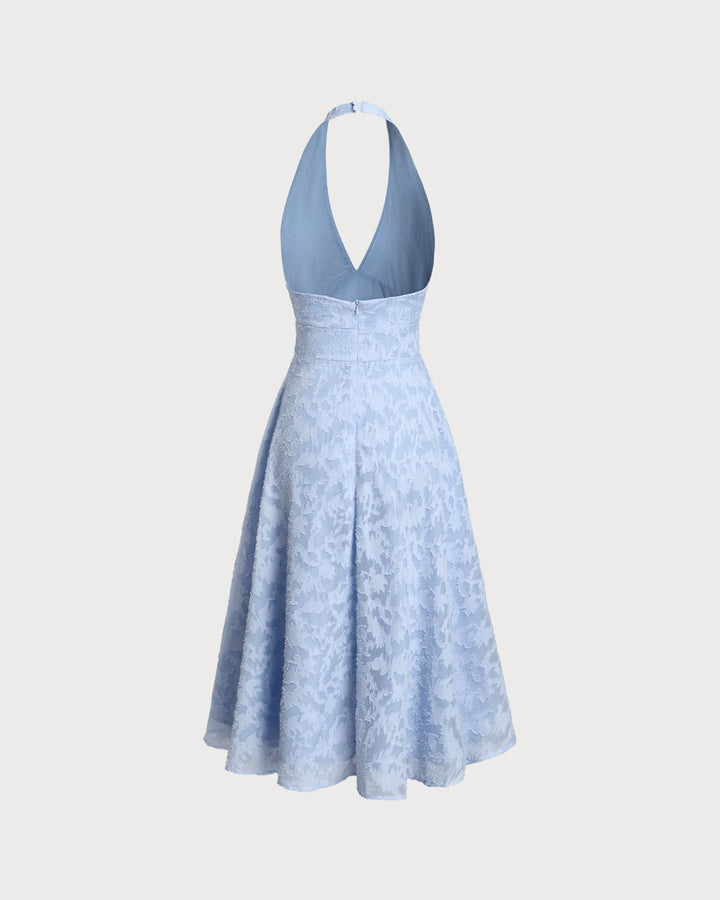 Mavi Dokulu Sırtı Açık Askılı Midi Elbise