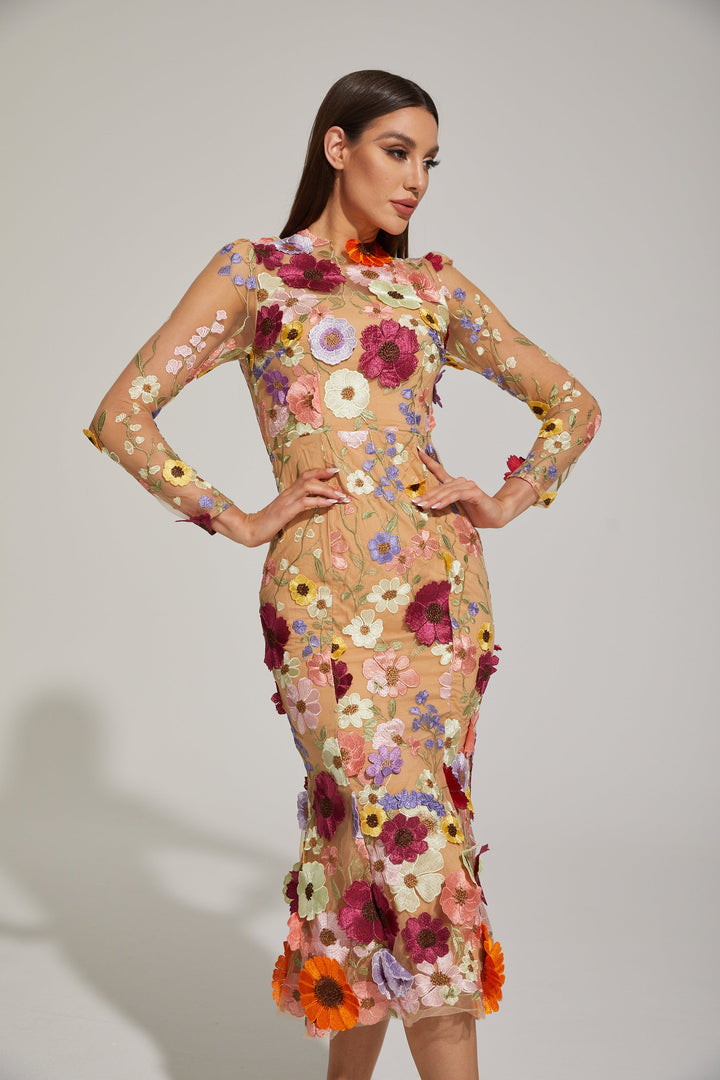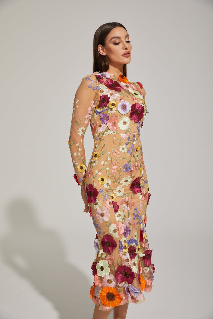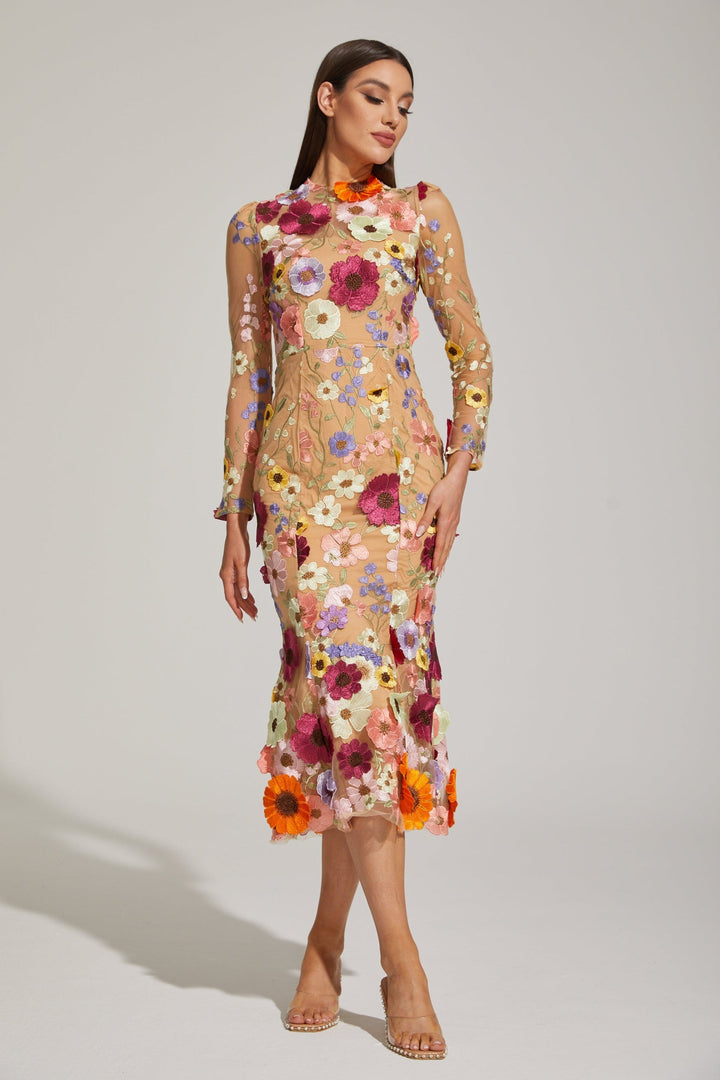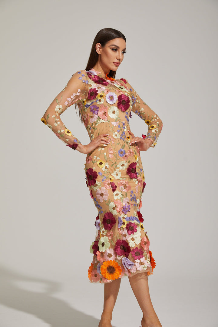 Lilas Enchanted Çiçekli File Midi Elbise