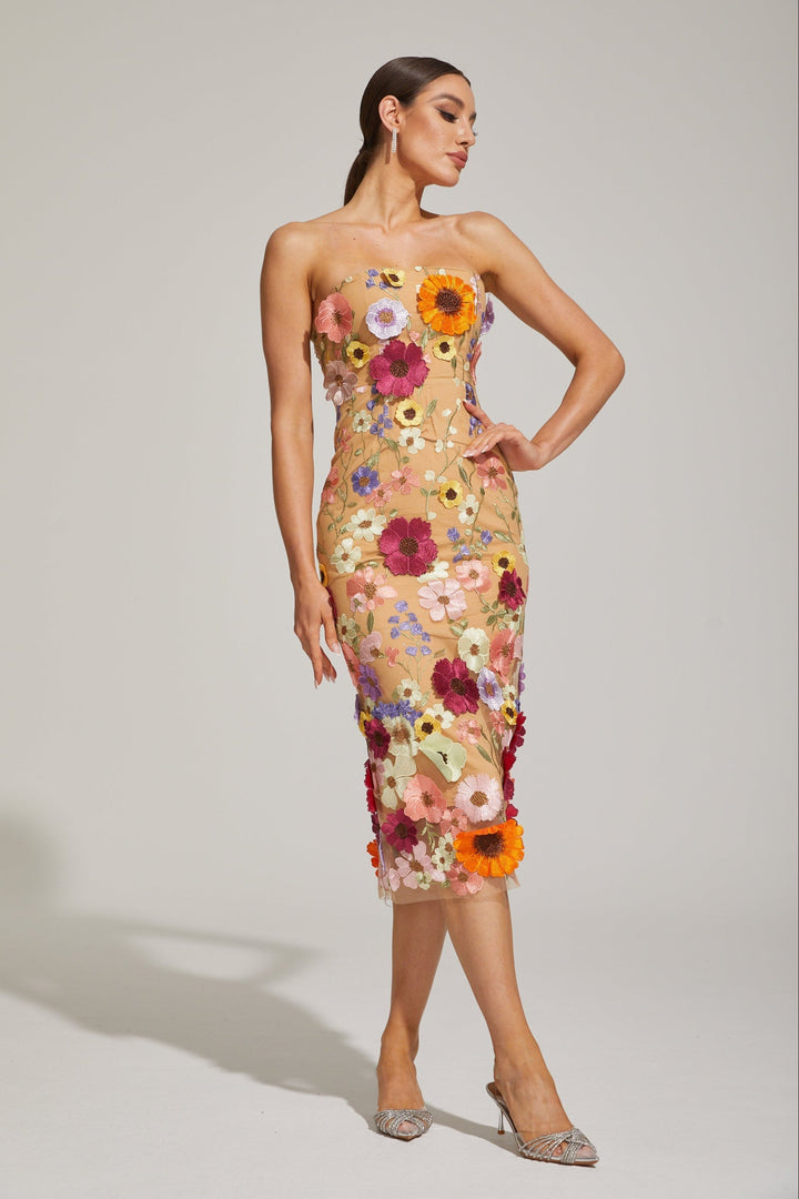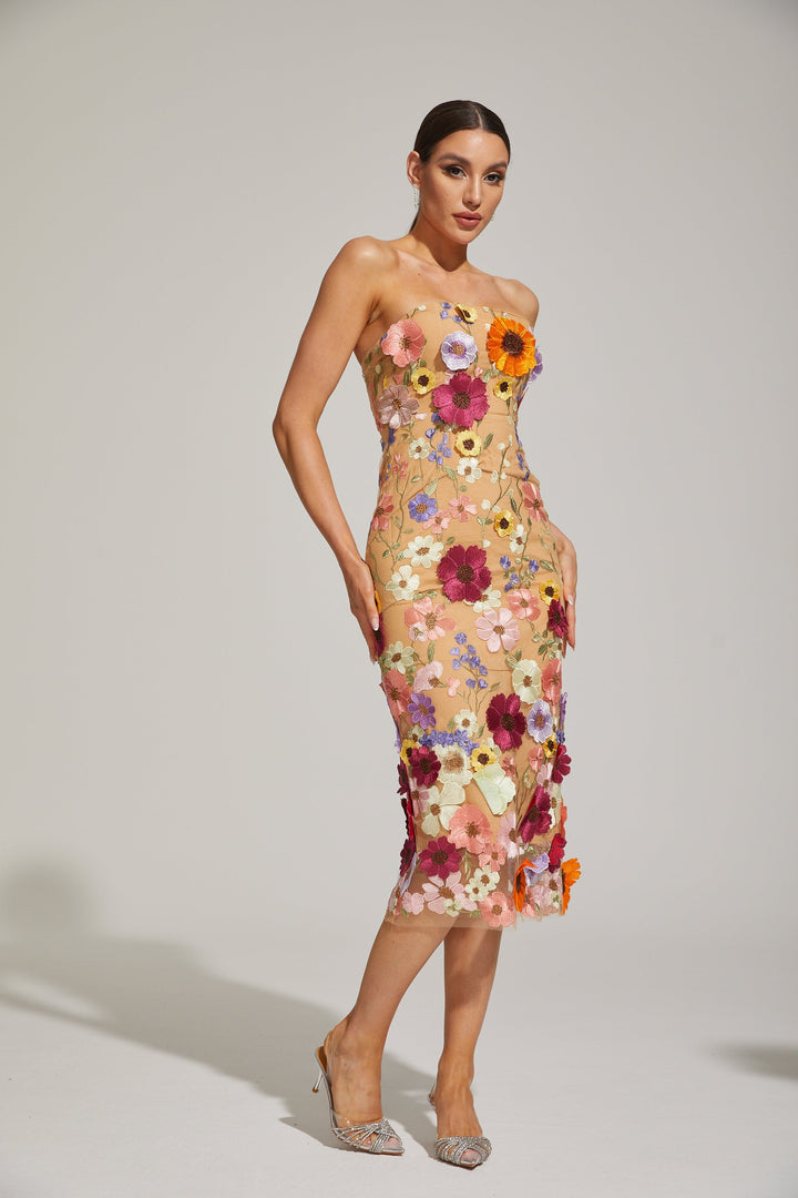Lilas Çiçekli Straplez Midi Elbise