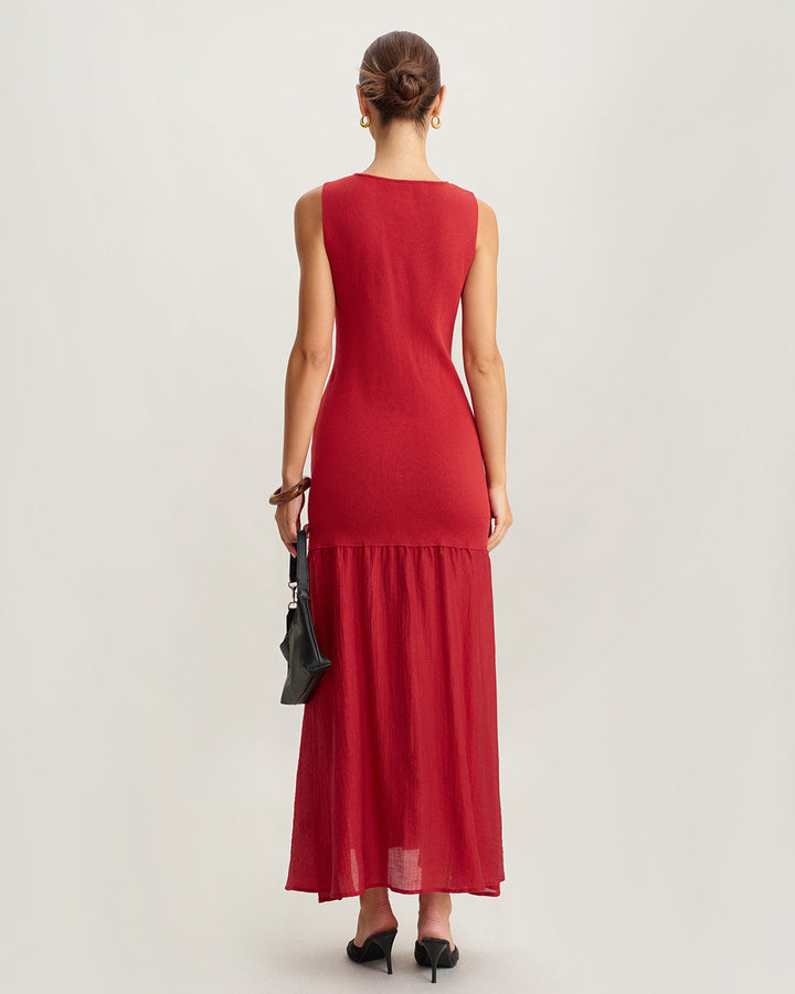 Kırmızı Ribanalı Örme Kolsuz Uzun Elbise