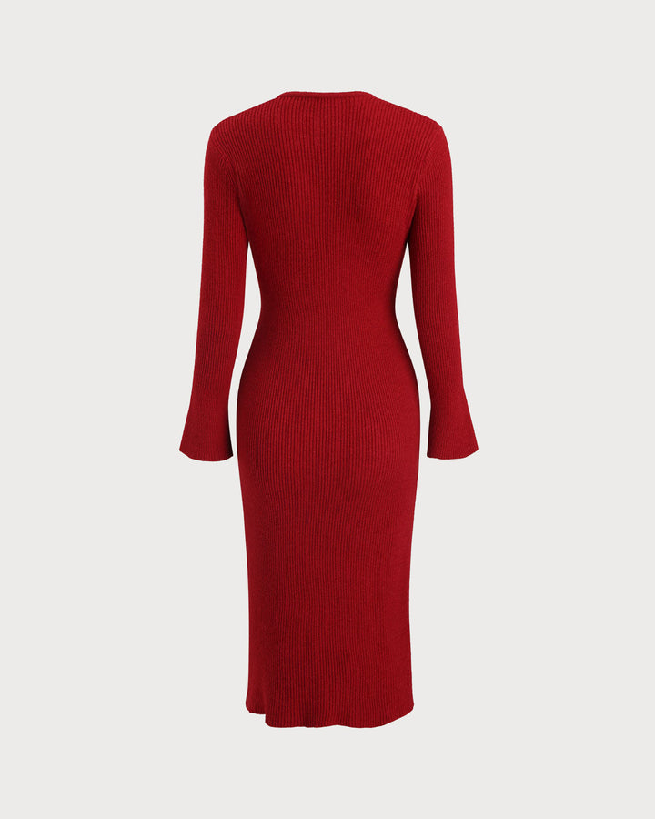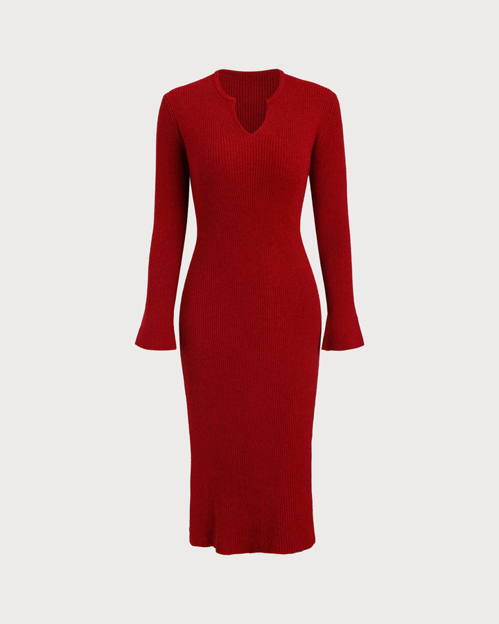 Kırmızı V Yakalı Ribanalı Kazak Elbise