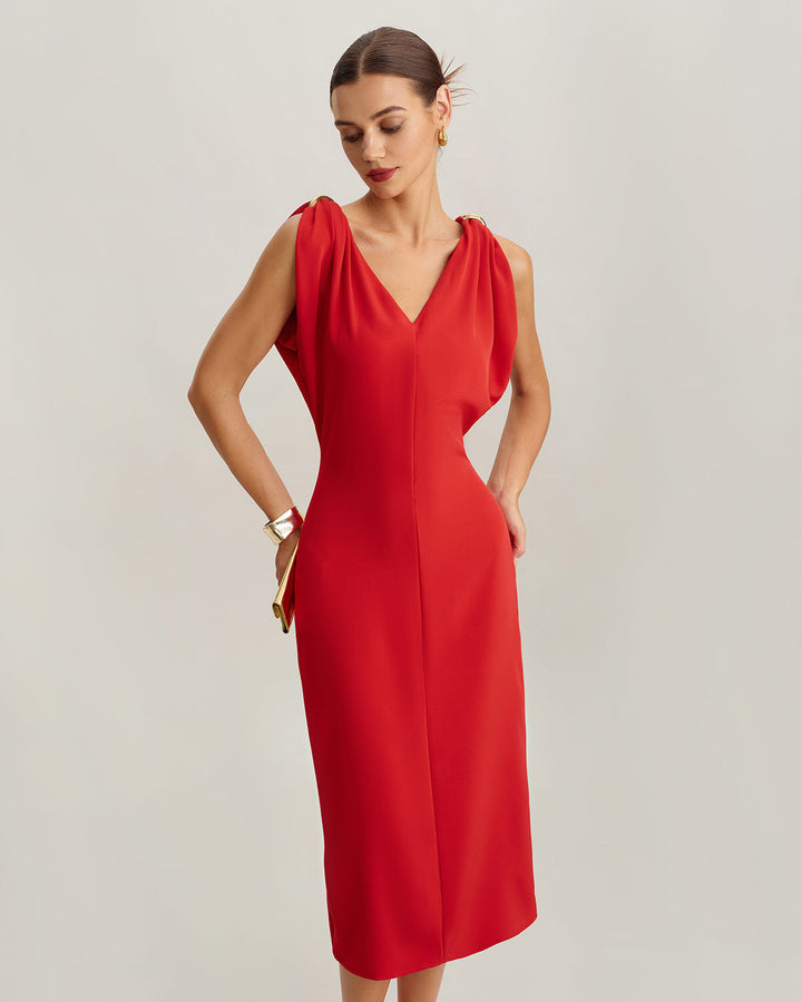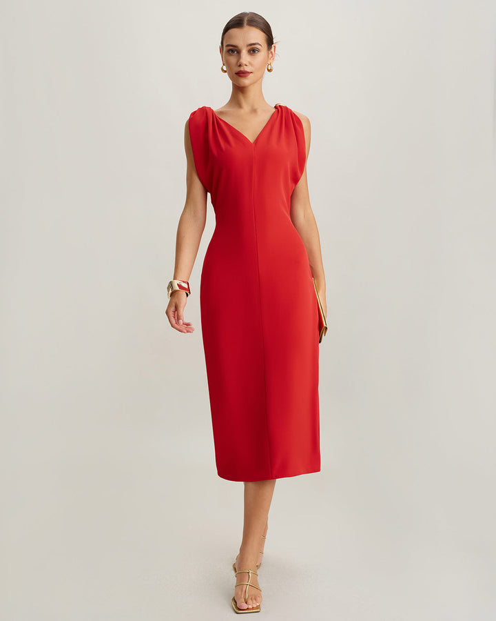 Kırmızı V Yaka Kolsuz Midi Elbise