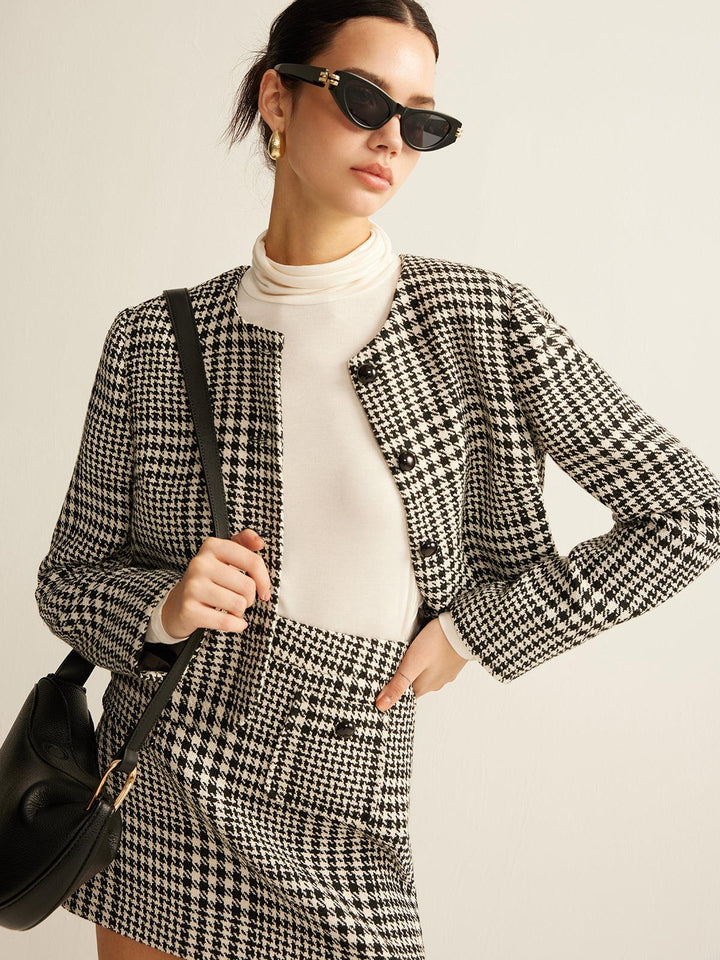 Siyah Beyaz Kazayağı Desenli Kısa Ceket