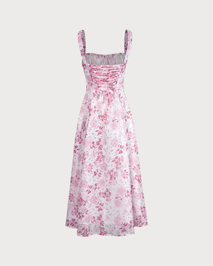 Pembe Kare Yakalı Çiçekli Kıvrımlı Midi Elbise