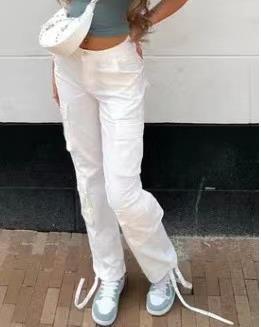 Yüksek bel, çok cepli, bol paça kargo pantolon.
