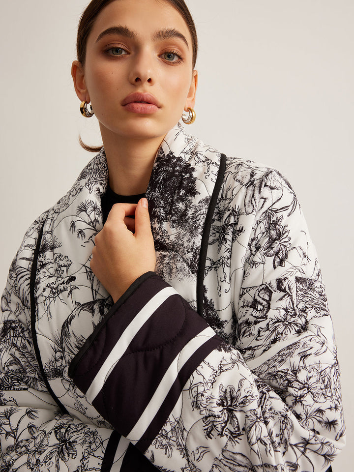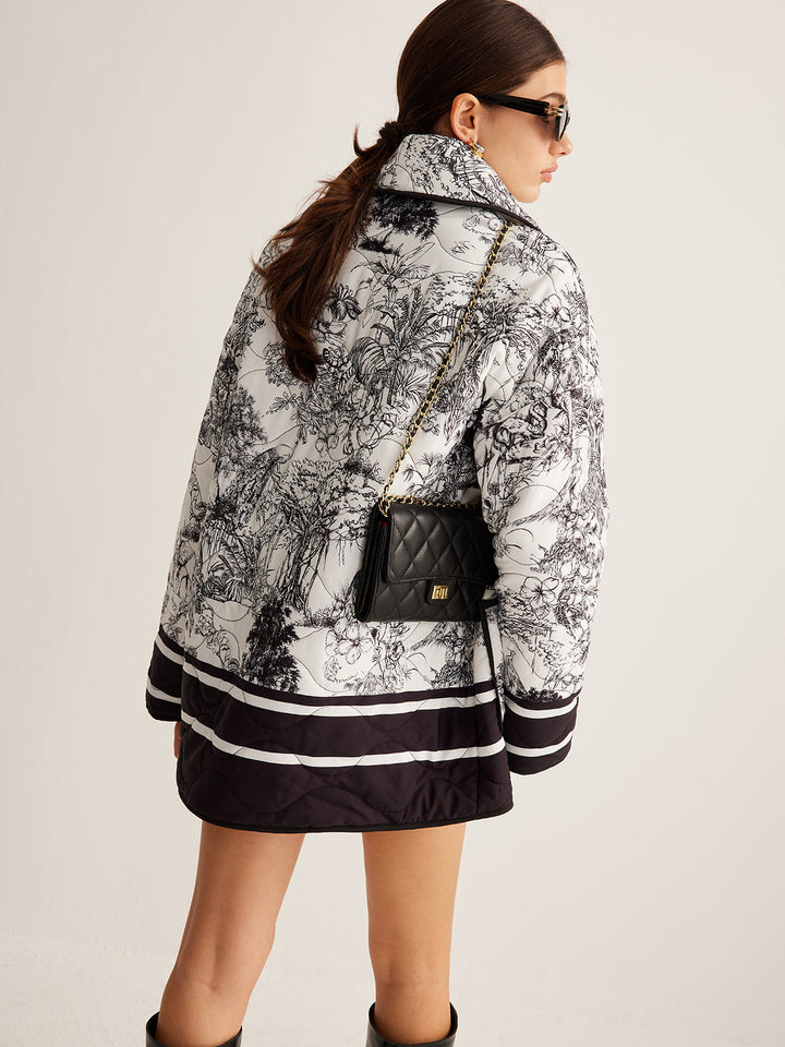 Sanatsal desenleriyle öne çıkan bu kuşaklı oversize mont, modern bir görünümü sofistike bir dokunuşla birleştiriyor. Geniş formu rahatlık sağlarken, kuşak detayı bedeni zarifçe sarmalıyor. Siyah ve beyaz kontrast desenleri, stilinizi her ortamda dikkat çekici hale getiriyor. Hem günlük kombinlerde hem de akşam şıklığında vazgeçilmez bir parça olacak.