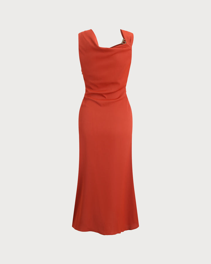 Tuğla Kırmızısı Kapüşonlu Yaka Kolsuz Midi Elbise