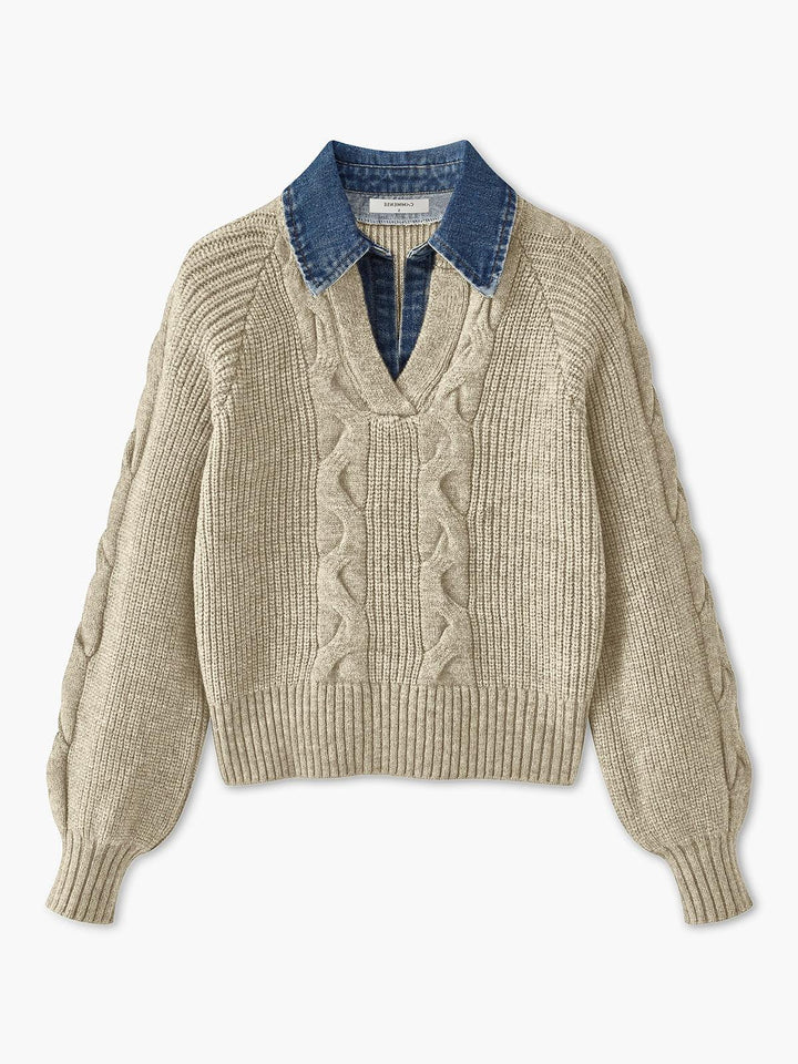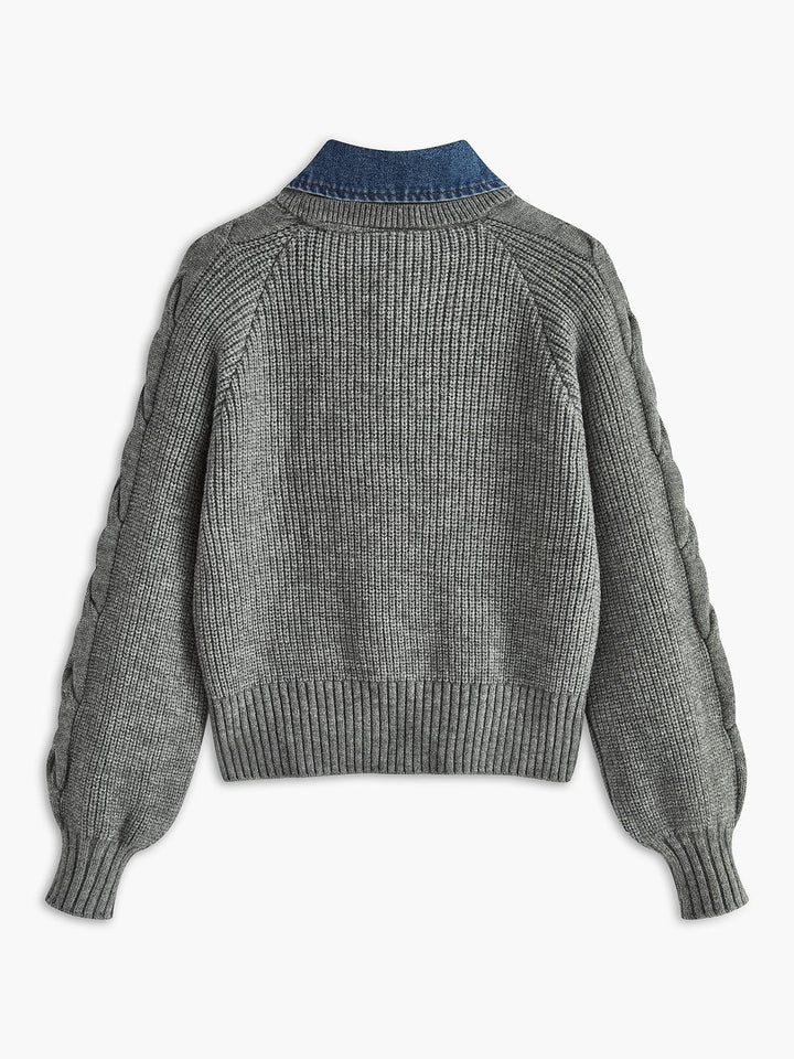 Denim Yakalı Örgü Detaylı Gri Kazak