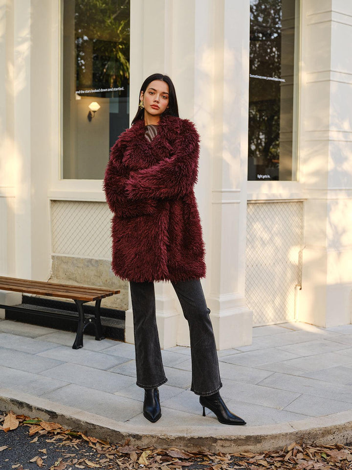 Yumuşak dokusu ve bordo rengiyle lüks bir görünüm sunan bu tüylü kürk ceket, kış stilinizi yükseltecek bir parça. Hem casual hem de özel kombinler için göz alıcı bir seçim!