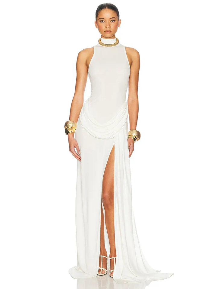 Blifanbo Kadınlar İçin Boğazlı, Omuz Açık, Kolsuz, Yırtmaçlı, Yüksek Belli, Pileli Maxi Elbise – Zarif, Şık, Kulüp ve Parti Elbisesi