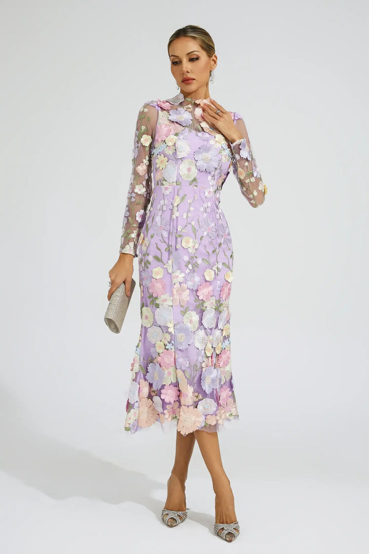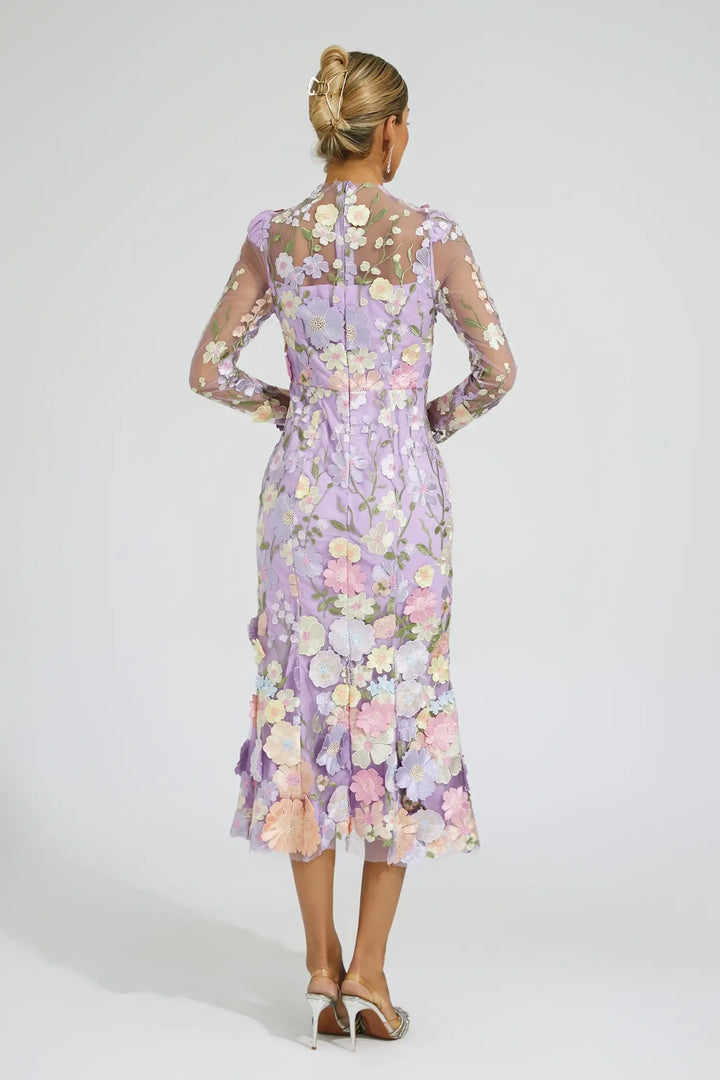 Helena Mor Çiçek İşlemeli Midi Elbise