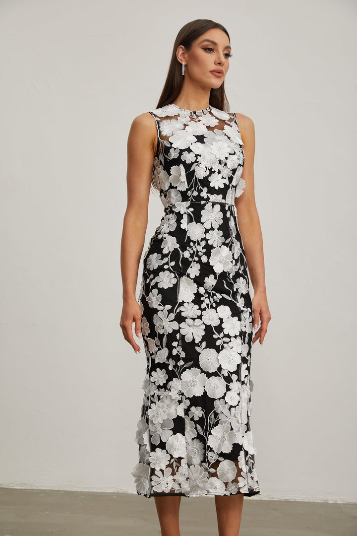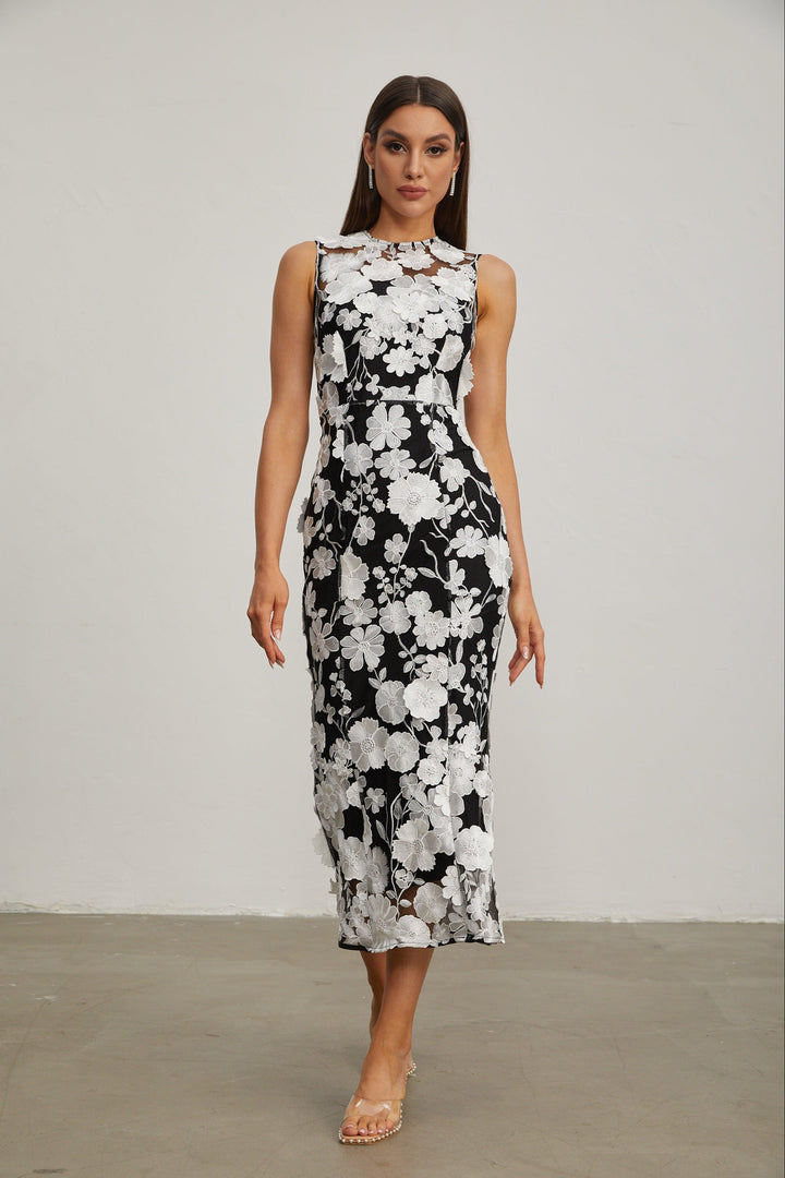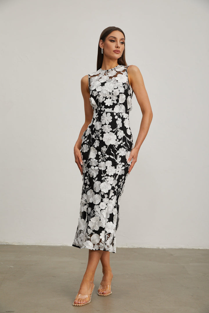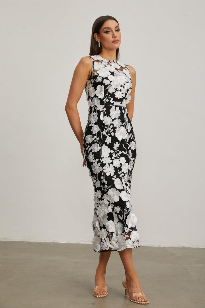 Johanna Siyah Çiçekli Dantel Midi Elbise