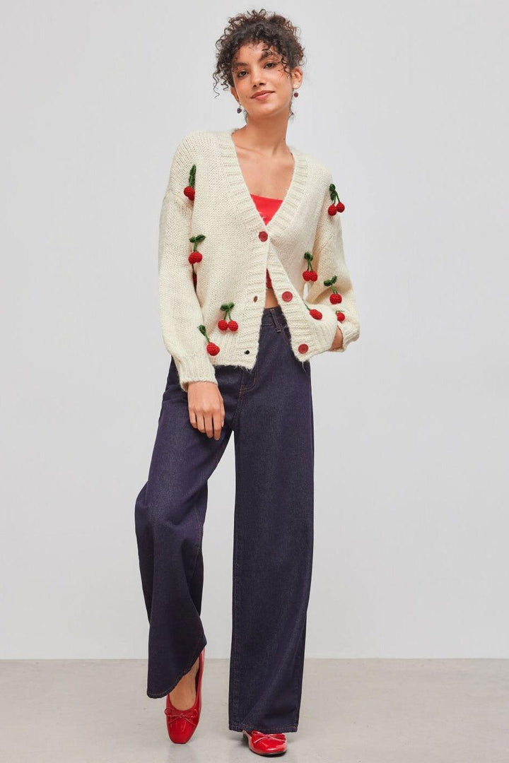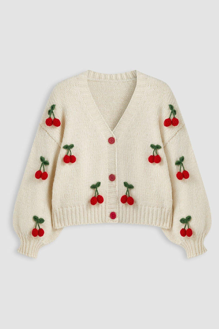 Bu tatlı V yakalı hırka, eğlenceli bir dokunuş katan büyüleyici kiraz süslemesiyle sonbahar ve kış için mükemmeldir. Rahat kesimi ve tek sıra düğmeli kapamasıyla tasarlanan bu parça, sevimli ve rahat bir görünüm için her türlü kıyafetin üzerine kolayca giyilebilen çok yönlü bir parçadır.