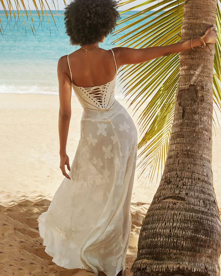 Beyaz Jakarlı Slip Uzun Elbise