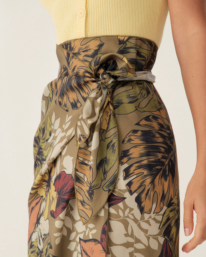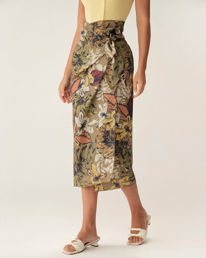 Haki Çiçekli Yüksek Bel Sarma Midi Etek