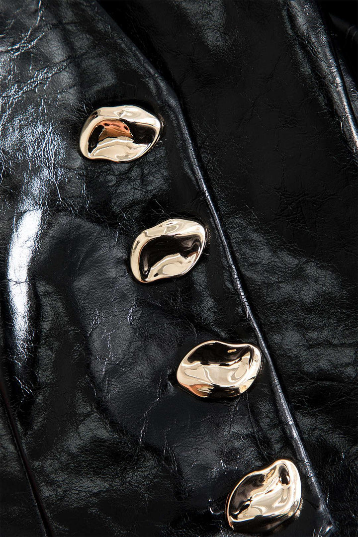 Lustrous Noir Deri Ceket, iddialı tasarımı ve çarpıcı detaylarıyla modern kadınların cesur tarzını yansıtan özel bir parçadır. V yaka kesimi, yapısal omuz detayları ve altın düğmelerle süslenmiş bu ceket, özgün ve lüks bir görünüm sunar. Parlak deri dokusu, sofistike ve güçlü bir stil oluşturur.