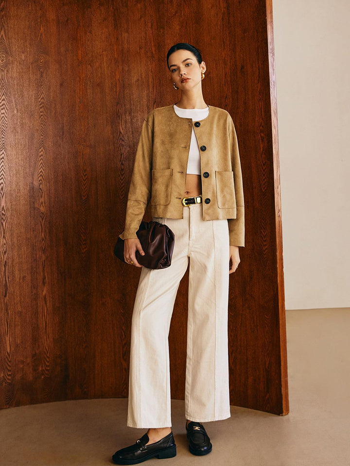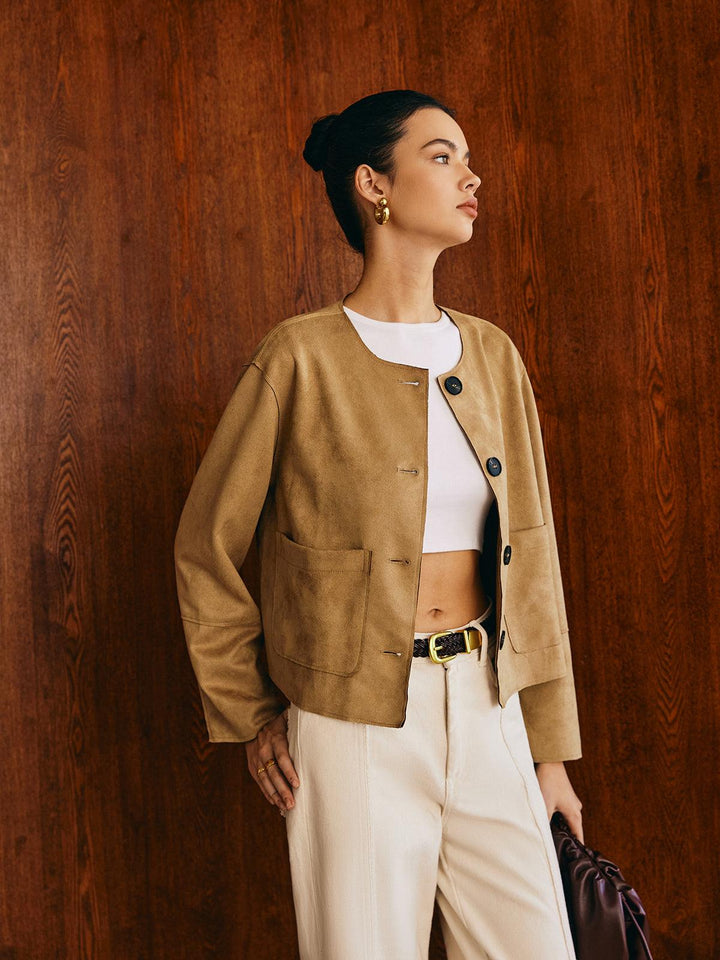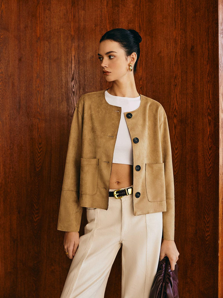 Rustic Charm Süet Ceket, modern ve doğal dokunuşları bir araya getiren şık bir parçadır. Minimal kesimi ve geniş düğme detaylarıyla zamansız bir tarz sunar. Hem rahat hem de elegan bir görünüm yakalamak isteyenler için idealdir. İster günlük kombinlerinizde ister iş şıklığınızda rahatlıkla kullanabilirsiniz.