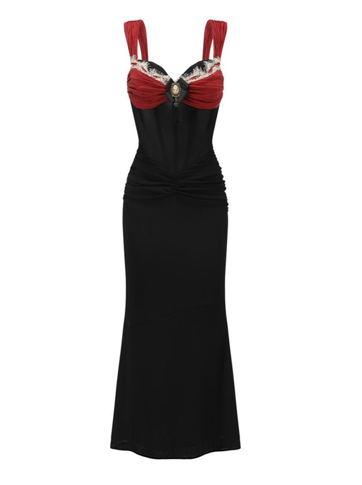 Bu kaşkorse tarzındaki elbise, yarı açık yaka tasarımı ve tank kol stili ile sıcak yaz günleri için mükemmel bir seçenek. Ayak bileği uzunluğunda olan bu elbise, kılıf silueti ile vücuda oturur ve zarif bir görüntü sağlar. Aplikler ve yama işi detayları ise şıklığına şıklık katıyor.